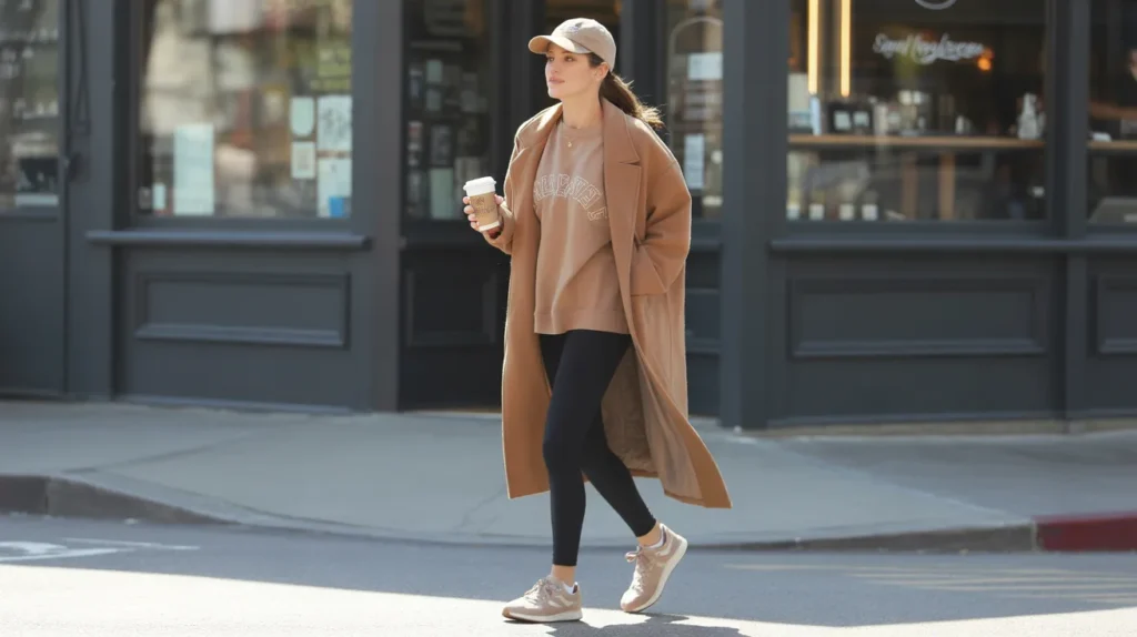 A camel coat layered over a chocolate sweatshirt and black leggings, finished with beige chunky sneakers — it’s a color story that’s quiet but incredibly polished. Add a baseball cap and you’ve got just enough attitude to keep it from feeling too “put together.”