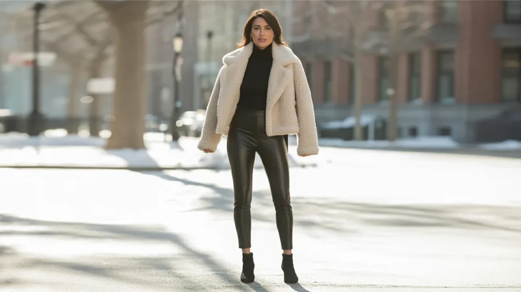 A cream shearling jacket paired with a black turtleneck and leather-look leggings — it’s the kind of mix that reads “just left a Parisian café” without you having to say a word. The texture contrast between the soft, fluffy jacket and the sleek leggings is what makes it work. Finish with black ankle boots for a silhouette that stays clean and doesn’t compete with the coat.