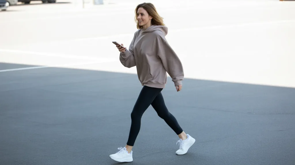 A taupe oversized hoodie, black leggings, white sneakers — this is the formula for looking effortlessly cool on your busiest days. The proportions are doing the real work here: slightly oversized on top, sleek on the bottom. That balance is what keeps it from reading as “I gave up” and instead says “I just know what I’m doing.”