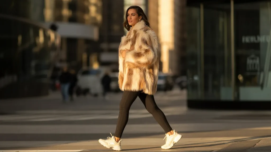 An oversized faux-fur coat over black leggings and white chunky sneakers is high-low dressing at its most fun. The plush coat does all the heavy lifting. The leggings keep the bottom half sleek and grounded so the coat can shine without the outfit feeling overwhelming.