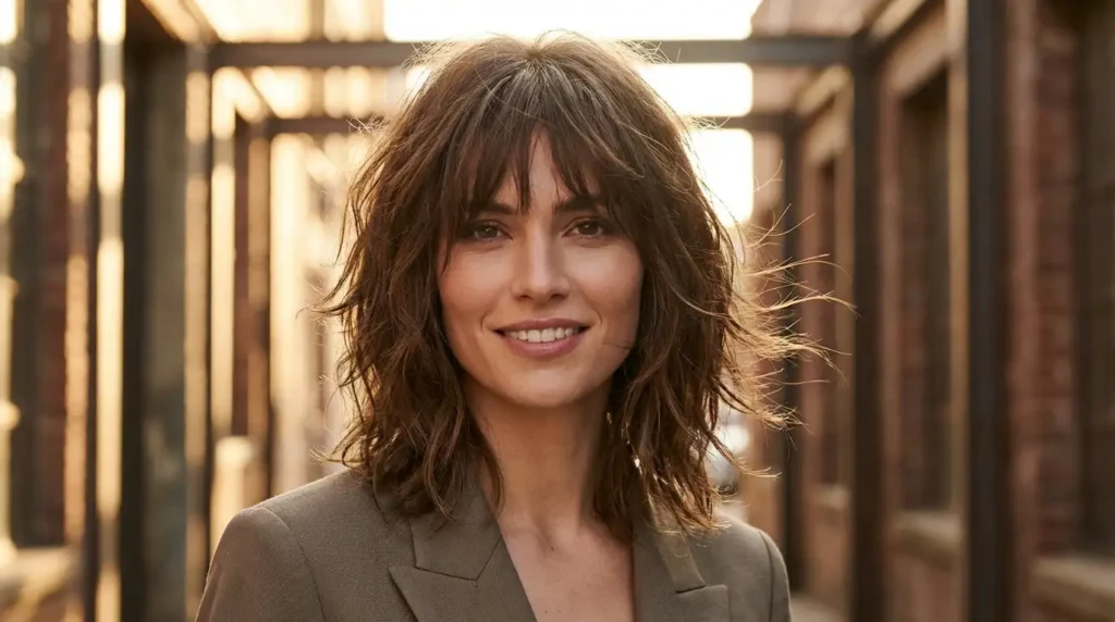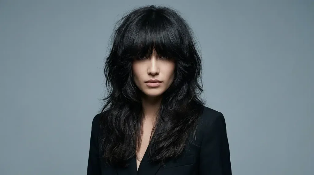 The wispy bangs are feathered and soft, not heavy or blunt. They’re the perfect complement to the textured layers, adding to the overall undone aesthetic.