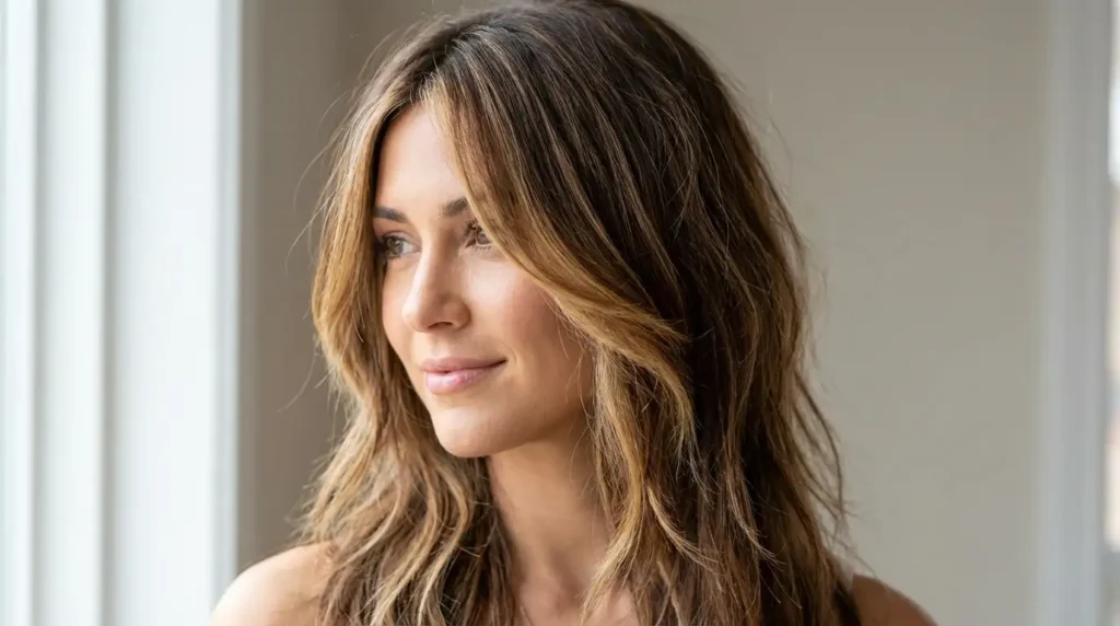 The side part creates asymmetry that’s incredibly flattering. One side sweeps dramatically across your face while the other showcases your layers fully. It’s elegant with an edge.