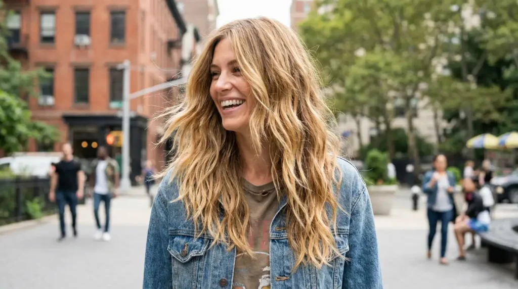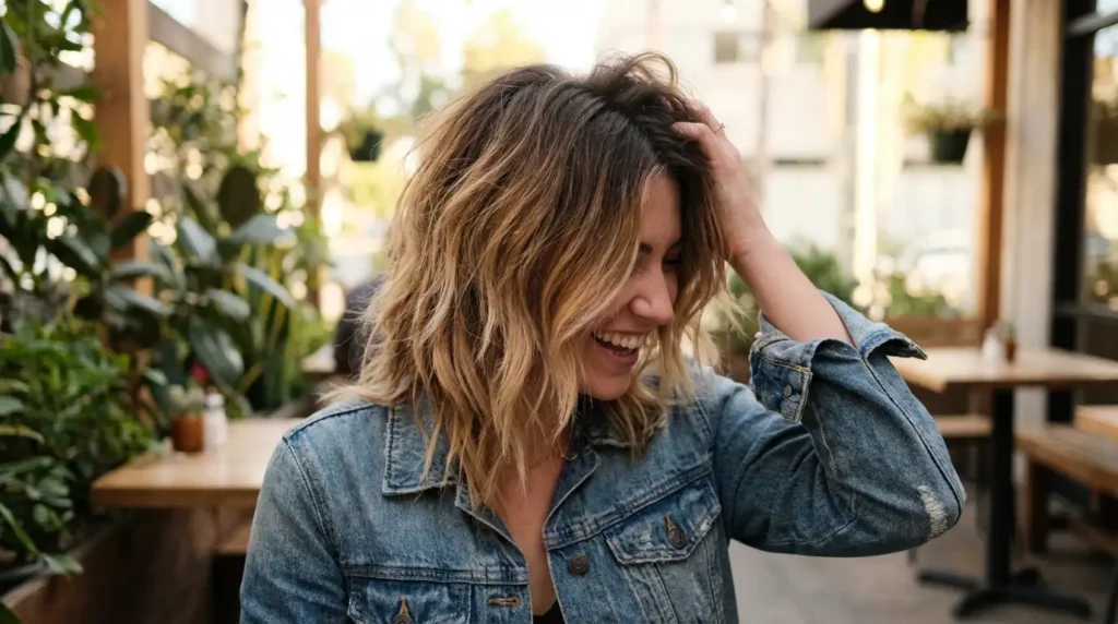 This low-maintenance style features choppy layers with grown-out color that shows natural roots. The “lived-in” aesthetic means you’re not trying to hide regrowth – it’s part of the look.