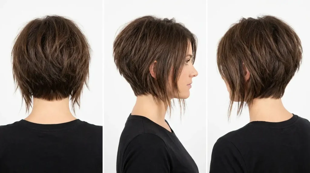 This style features choppy layers that are shorter in the back and gradually lengthen toward the front. The back is stacked for volume, while the front features long, face-framing pieces.
