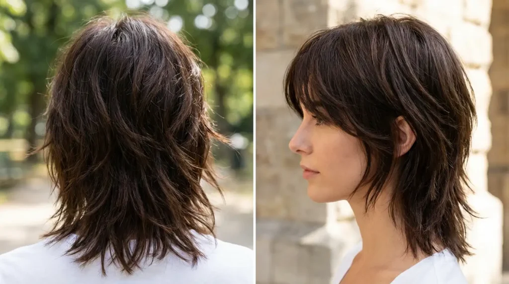 Best for: Square, oval, and heart face shapes. The soft texturing balances strong features. Best on straight to slightly wavy hair where the shag texture shows clearly.