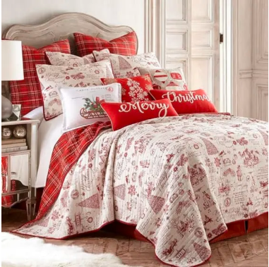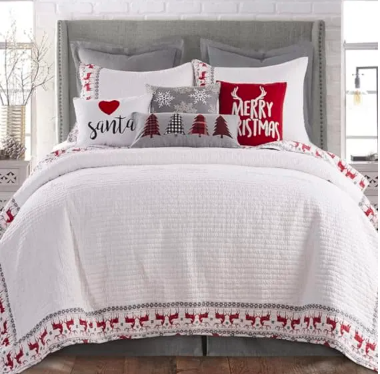 Your bed is usually the biggest thing in the room, so whatever you put on it instantly sets the tone. A festive comforter or quilt can make the whole space feel warmer, more intentional and a lot more “holiday” without you having to add decorations to every corner.
