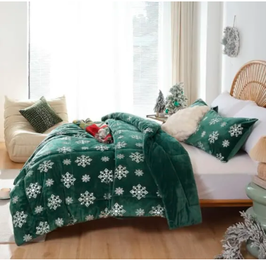 This one is pure winter luxury. Picture a deep emerald green velvet comforter with soft snowflakes scattered across it. It’s the type of bedding that instantly makes your bed look more expensive and hotel-level cozy.
