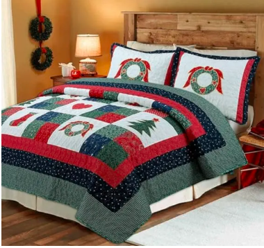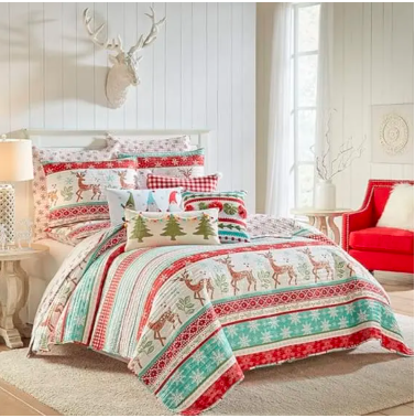 This type of quilt goes straight for the playful side of Christmas: Santas, snowmen, presents, and whimsical scenes across the fabric. It usually comes with matching pillow shams so the whole bed feels coordinated.