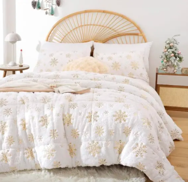 If you love neutral decor but still want your bed to feel Christmassy, this style is a great middle ground. Imagine a white or cream comforter sprinkled with golden snowflakes—soft, elegant, and a little bit glam.
