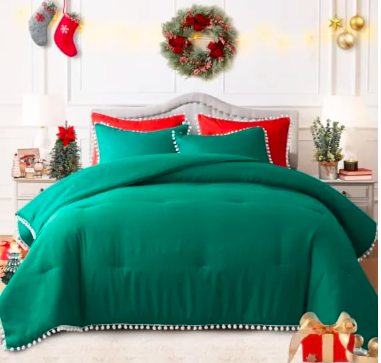 This style blends Christmas color with fun little details. A rich green comforter trimmed with pom pom fringe or tufted edges looks both playful and stylish.