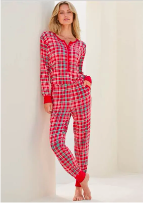 If you love feeling completely bundled up, a tartan onesie is a win. This one comes in red and green plaid, with a henley button front and a comfy, slightly fitted cut.
