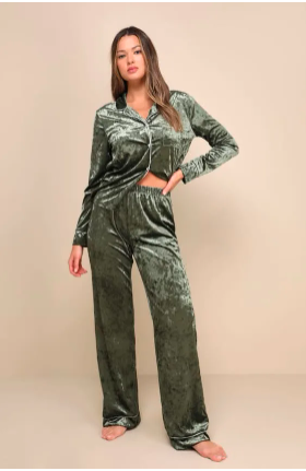 Deep green velvet instantly screams “holiday luxury.” This set drapes beautifully and feels soft and warm against the skin, with piping or trims that give it structure.