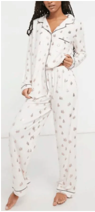 This pajama set features fun Santa prints scattered across the fabric—jolly, but still wearable. It’s the ideal “Christmas Eve by the fireplace” outfit.