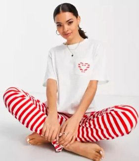 This one is a cute combo: a simple white tee with a holiday graphic or motif, paired with red or candy-cane striped bottoms.