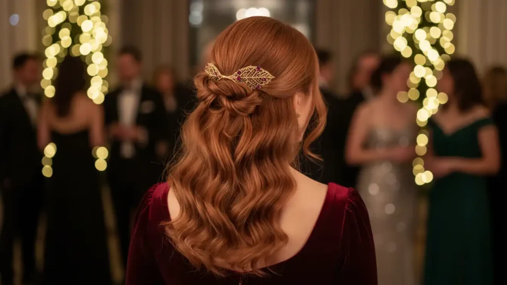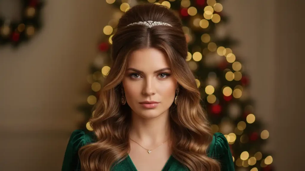 Half-up, half-down styles are a holiday favorite because they flatter almost everyone. Adding volume at the crown makes the look feel party-ready instead of casual. You can keep the top sleek or slightly loose for a softer finish. The bottom section works well straight, wavy, or curled. A decorative clip or barrette adds just enough holiday sparkle.