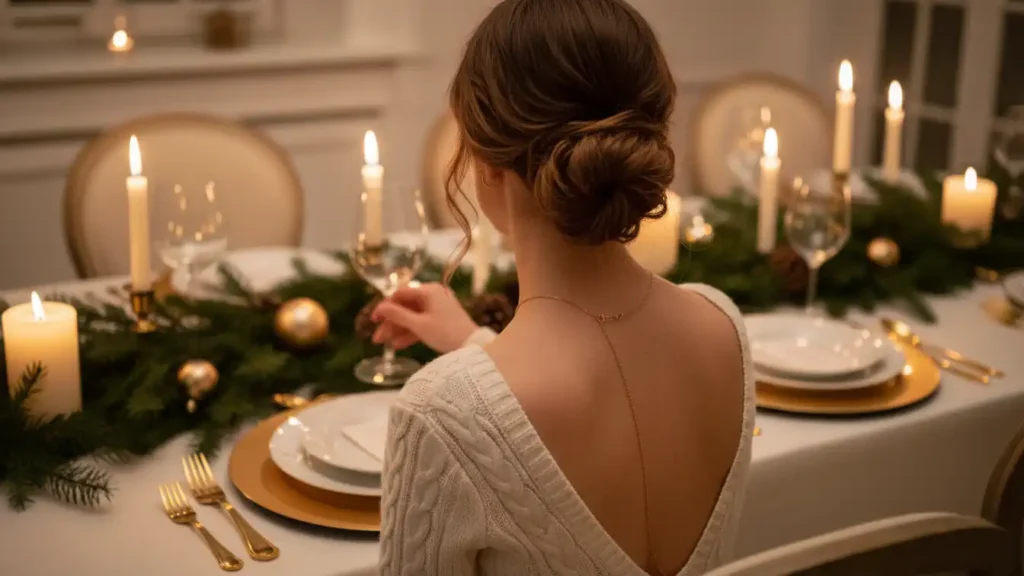 A soft romantic updo is perfect when you want something elegant but not stiff. Loose twists and gentle texture keep the style feeling natural. It works well for both casual holiday dinners and more formal celebrations. The slightly undone finish makes it feel effortless and timeless. Adding a delicate hair accessory gives it a festive touch.