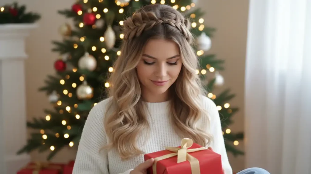 A braided crown looks intricate but is surprisingly easy to pull off. Braids add texture and detail without feeling too formal. This style keeps hair out of your face while still looking special. It works beautifully for both casual Christmas gatherings and dressier parties. Small sparkly pins or subtle ribbon can make it feel extra festive.