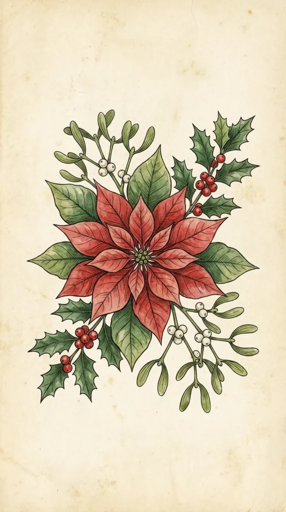 Botanical Illustrations: Vintage-style botanical drawings of Christmas plants—poinsettias, holly, mistletoe—rendered in classic red and green bring an artistic, educational quality to your wallpaper. These are perfect for users who appreciate art and natural history.