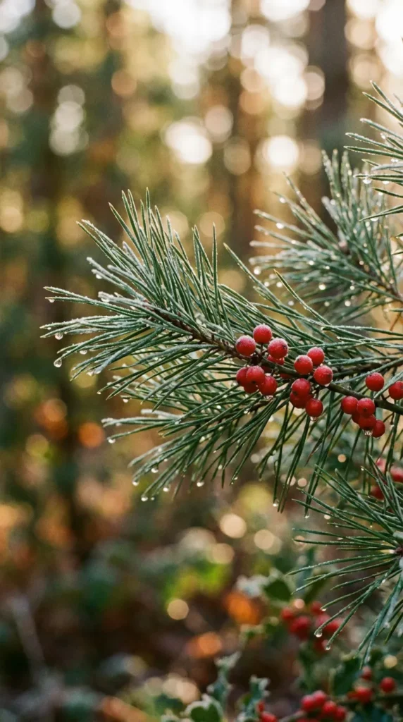Pine and Evergreen Close-ups: Macro photography of pine needles with drops of water or morning frost creates stunning wallpapers. The rich green of the pine with small pops of red from berries or ornaments nestled in the branches brings authentic Christmas nature to your screen. These photos typically have great depth of field, which helps your icons remain visible against the blurred background.