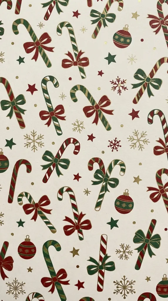 Traditional Gift Wrap Motifs: Candy canes, ornaments, bows, snowflakes, and stars arranged in classic repeating patterns create wallpapers that feel like your phone has been wrapped for Christmas. These busy patterns work best on lock screens or for users with very minimal home screen setups.