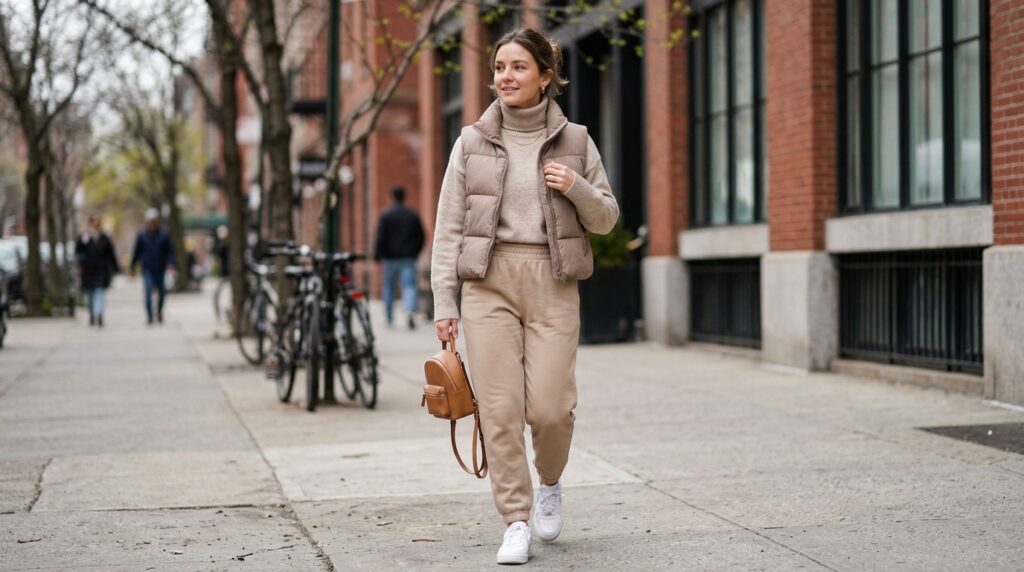 There’s something quietly magnetic about a beige-on-beige outfit. A soft neutral turtleneck layered under a quilted puffer vest, paired with matching joggers and white sneakers — it’s the kind of look that says “I have my life together” without trying too hard.