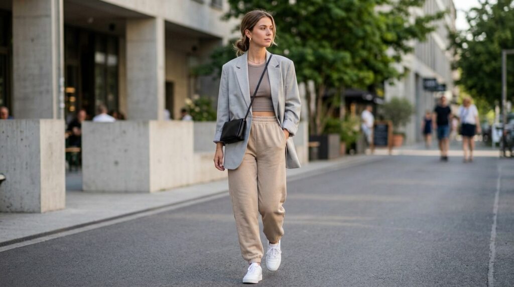 You might be wondering: can joggers really look professional? With the right blazer? Absolutely yes. A taupe crop top layered under a light grey oversized blazer, with loose beige joggers and white sneakers, creates a look that’s both relaxed and refined.