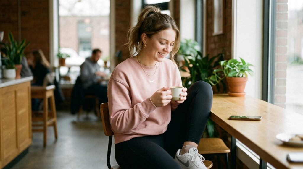 Athleisure outfits for women are going softer and more feminine in 2026, and this look is a perfect example. A blush pink sweatshirt with a Nike swoosh, smooth black leggings, and clean sneakers — it’s put-together enough for a coffee meet-up and comfortable enough for a workout.
