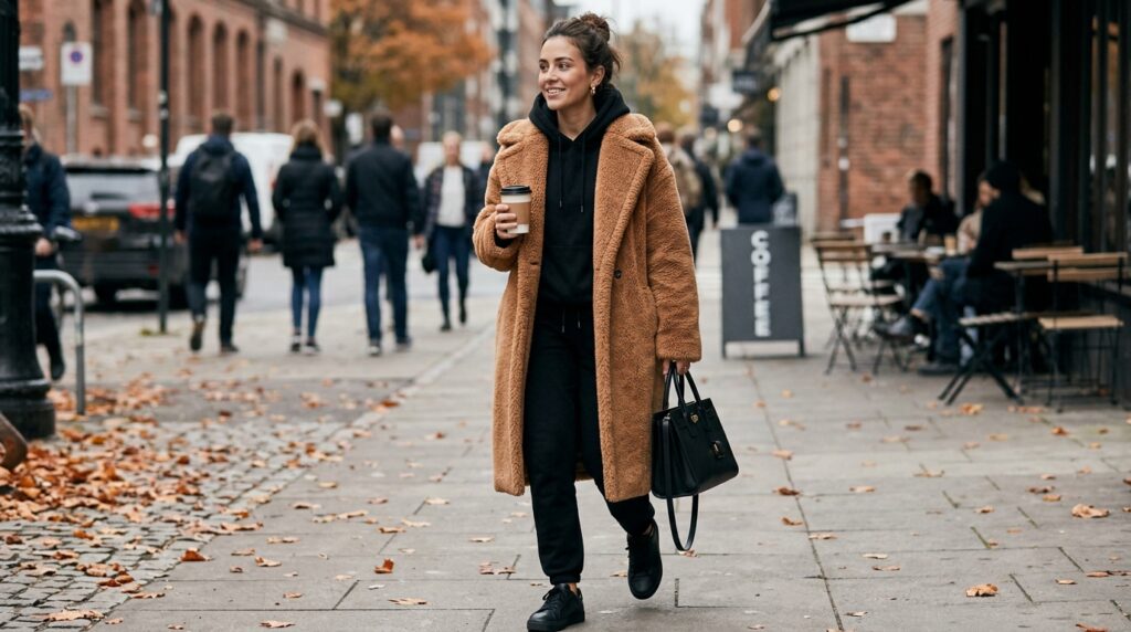 Here’s a combination that feels like a warm hug but looks incredibly polished: a caramel teddy coat over a full black sweatsuit, black sneakers, and a structured bag. The contrast between the rich teddy texture and the sleek monochrome base is pure fall magic.