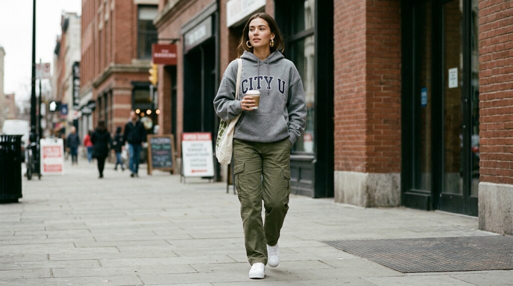 This one hits that sweet spot between sporty and street-smart. A grey hoodie with college lettering, olive cargo trousers, white sneakers, and chunky gold hoops — it’s downtown cool without trying to be.