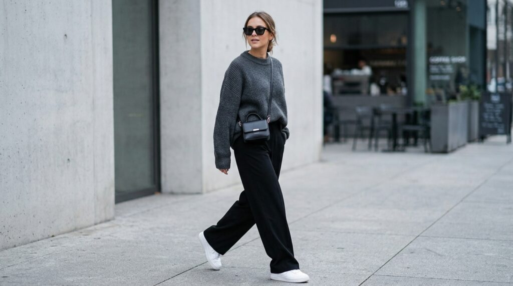 Minimalism doesn’t mean boring — and this look proves it. A big, soft grey sweater with black wide-leg trousers and white sneakers creates a silhouette that’s architectural but still completely comfortable.