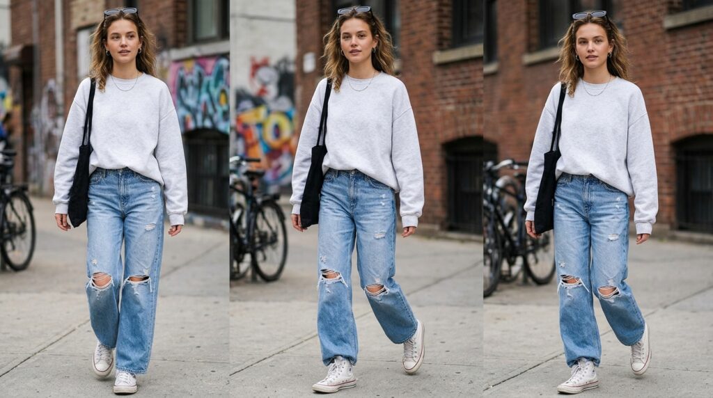Pure urban energy. A light grey sweatshirt, wide-leg ripped jeans, and white high-top sneakers — it’s nostalgic streetwear with a modern, relaxed twist. The oversized proportions give it that effortless model-off-duty feel.