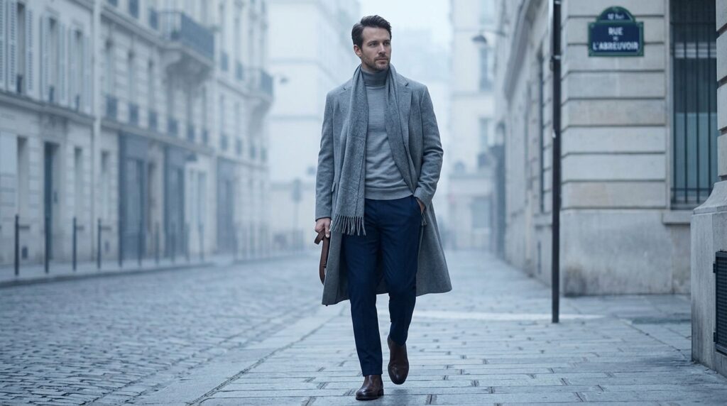 Grey is the unsung hero of the cozy style ideas 2026 conversation. An ash-grey turtleneck under a long matching wool coat, with navy trousers and a fringed scarf — it’s like a still morning in Paris put into outfit form.