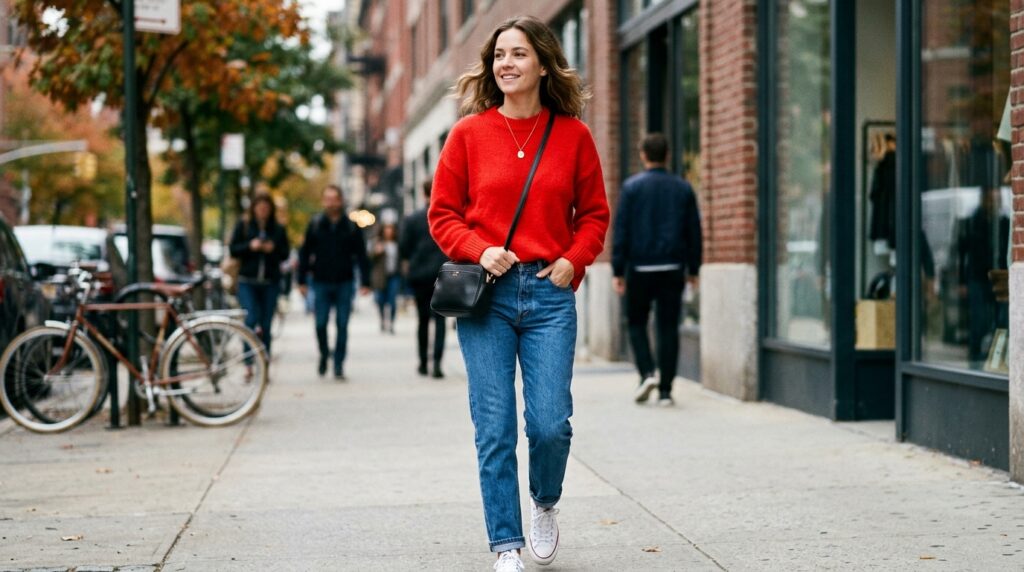What makes this work is the restraint everywhere else. Let the red sweater be the statement. Keep the rest clean. A black crossbody bag and a small gold pendant, and you’re done. This is proof that comfy casual outfits for women don’t have to play it safe — they just have to be honest.