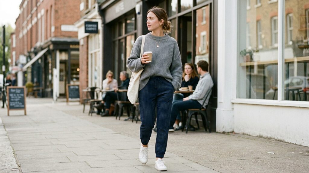 This outfit is the definition of slow-morning energy. An oversized ribbed grey sweater with pinstriped joggers and white sneakers — it’s one of those combinations that feels luxurious in its simplicity.