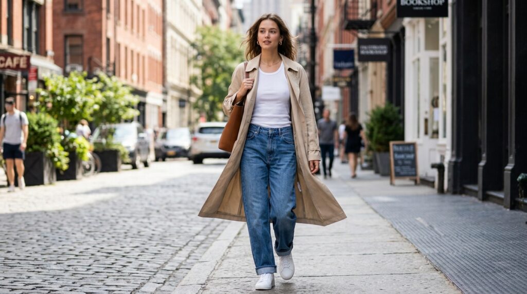 A classic trench coat is having a new moment in 2026 — and it’s not being worn over power suits anymore. Here it goes over a simple white tank, loose jeans, and white sneakers. Clean, crisp, and completely effortless.