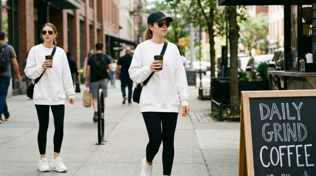 6. Street Coffee — White Oversized Sweatshirt + Black Leggings