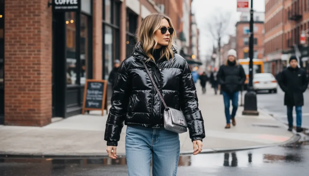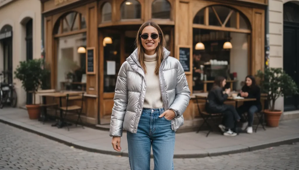Here’s where it gets interesting: metallic puffer jackets are genuinely having a moment in winter 2025–2026 street style, and the silver version is the most versatile of the bunch. Paired with a cream turtleneck and light-wash denim, a silver puffer jacket looks contemporary and futuristic without feeling costume-y.