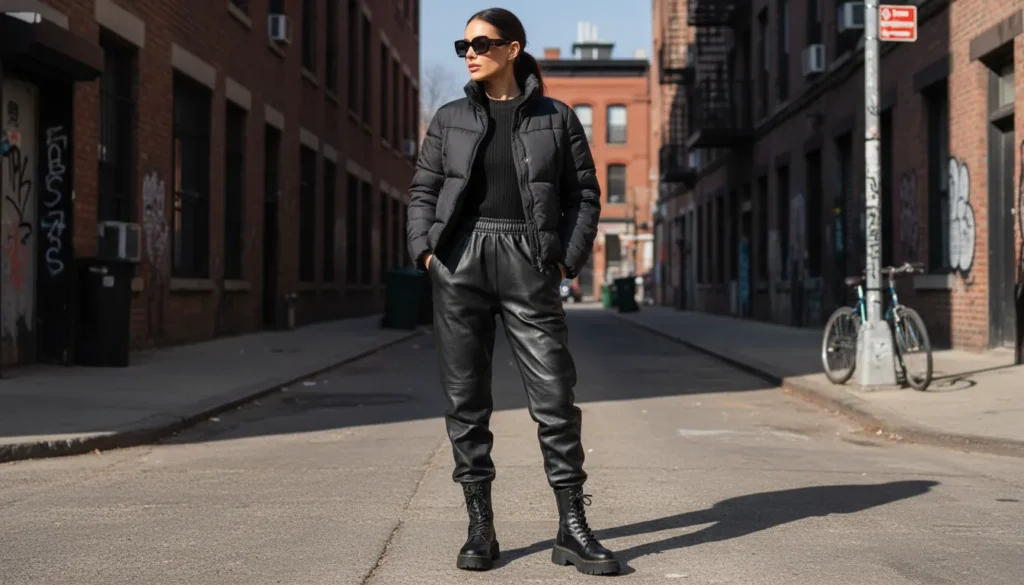 Every wardrobe needs at least one all-black outfit that makes you feel unstoppable — and this is it. A matte black puffer jacket with leather joggers and a fitted knit crop top is minimalism with attitude.