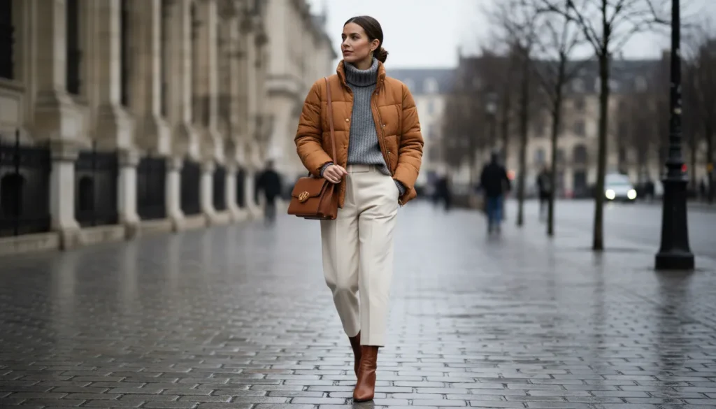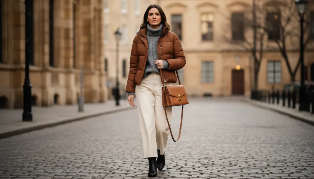 Warm brown tones paired with structured neutrals might be the most quietly elegant combination in winter 2025–2026 street style. A caramel puffer jacket with a gray turtleneck, cream cropped trousers, and heeled ankle boots is classic and modern at the same time.