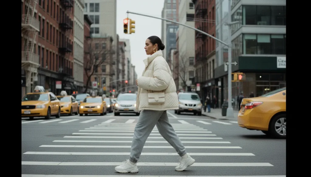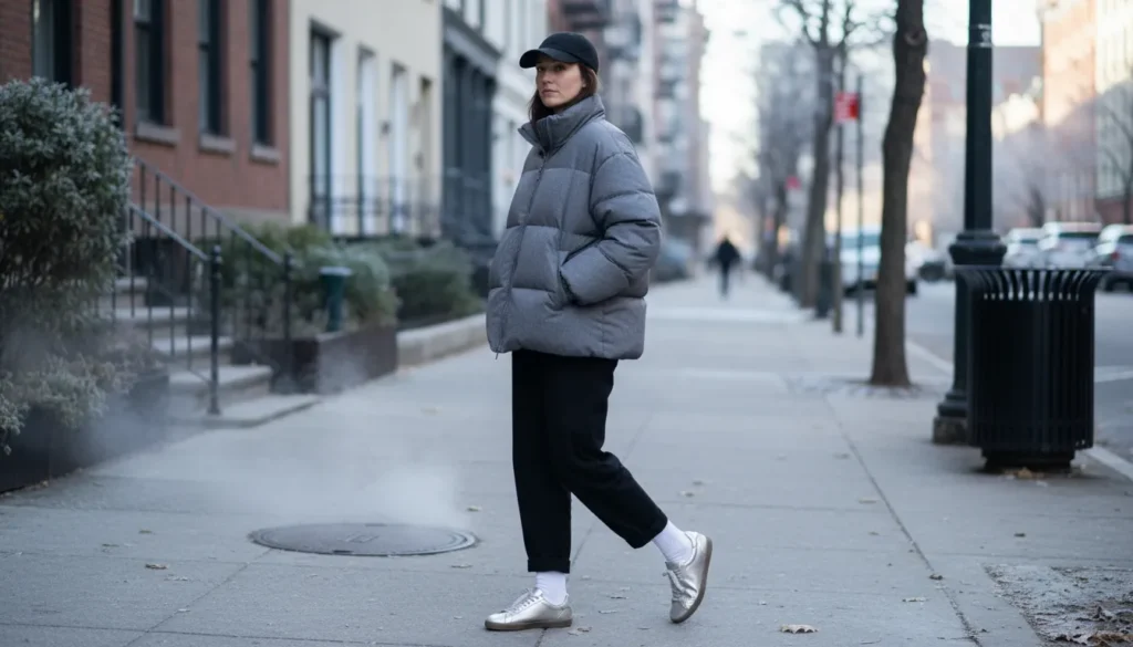 An oversized gray puffer jacket with black pants and silver sneakers is the athleisure aesthetic done properly. It’s cozy and casual, but there’s a deliberateness to the proportions that keeps it from looking sloppy.