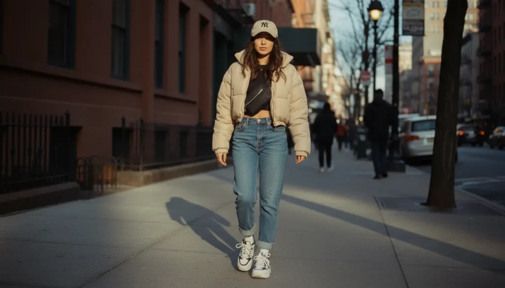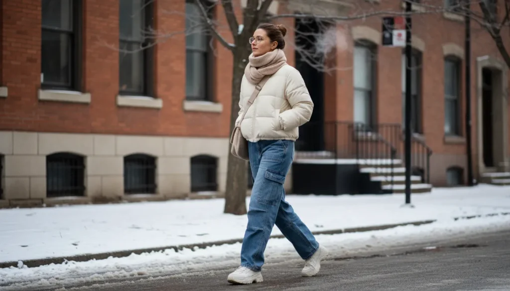 This one captures something that I think a lot of people are chasing right now: that not-trying-too-hard winter look that still gets compliments. A short cream puffer jacket with loose denim cargo pants and chunky white sneakers is practical, warm, and genuinely comfortable.