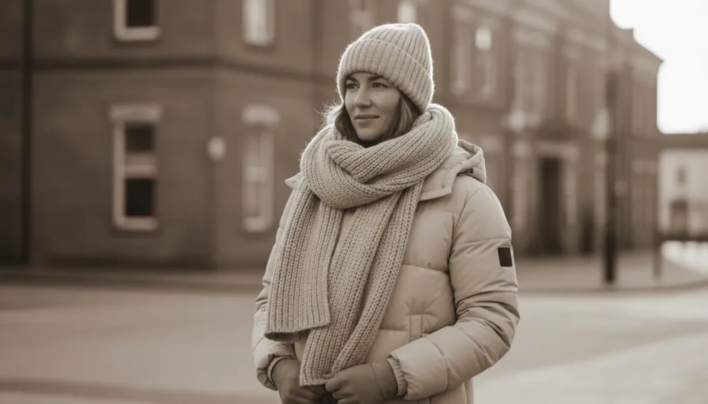 Full monochrome dressing is one of those approaches that looks difficult but is actually very forgiving once you commit to it. A creamy beige puffer jacket with a matching oversized knit scarf and beanie is that understated, sophisticated winter look that minimalists love.