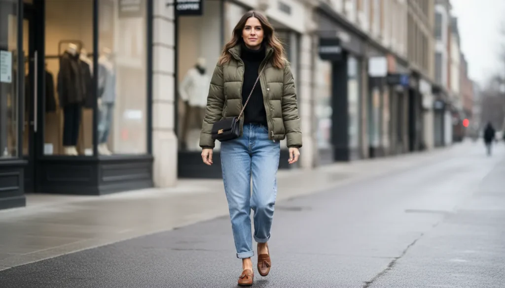 Olive green is one of those colors that quietly works with everything — black, beige, ivory, navy — and yet it doesn’t always get the credit it deserves. An olive green puffer jacket with light blue jeans, a black turtleneck, and loafers is that off-duty intellectual look that feels genuinely polished.