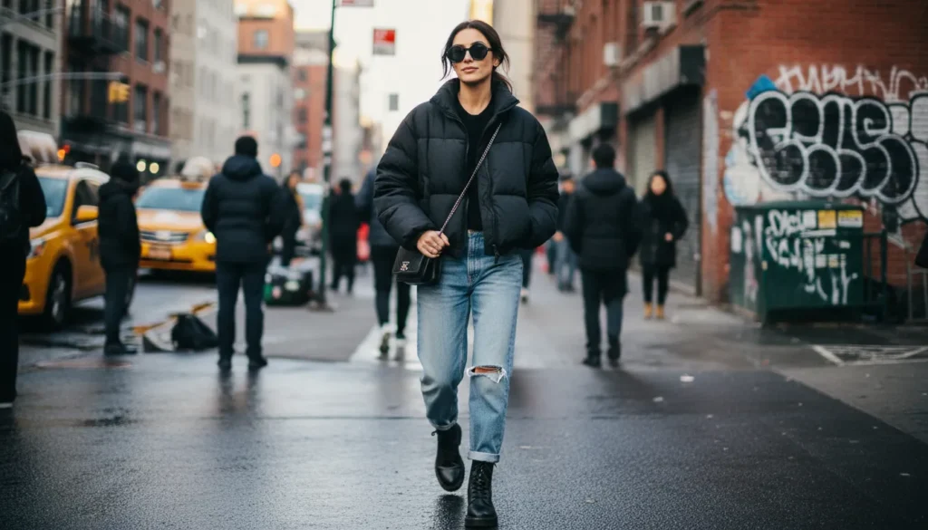 Some combinations are just classics — and a black puffer jacket with light-wash denim and lace-up boots is one of them. It’s the kind of look that works year after year without ever feeling tired.