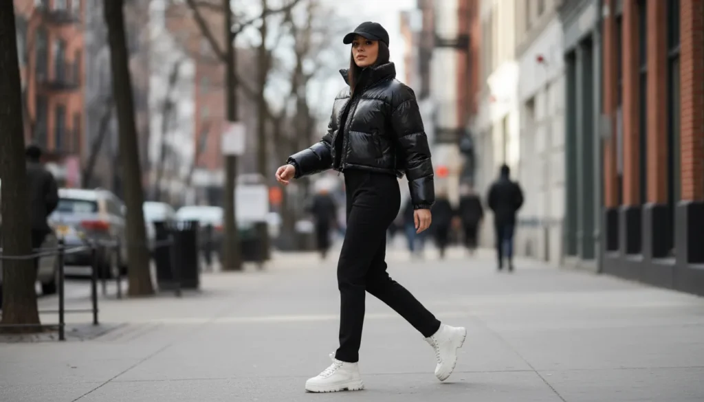 And the final cozy puffer jacket outfit in this roundup brings everything full circle. A cropped black puffer jacket with black pants, chunky white sneakers, and a baseball cap is the cleanest, most minimal look on this entire list — and one of the most wearable.