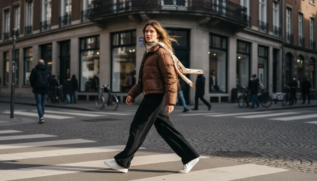 Minimalism isn’t about wearing less — it’s about wearing things that are intentional. This look nails that perfectly: a chocolate brown puffer jacket with a slight sheen, wide-leg black pants, and clean white sneakers.