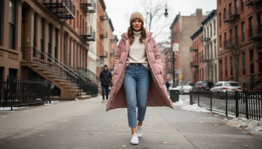 Muted pink in winter is one of my favorite combinations — it feels fresh and fancy at the same time, which is a hard balance to strike. A dusty pink longline puffer jacket with a cream turtleneck, cropped denim, and white sneakers hits that balance perfectly.