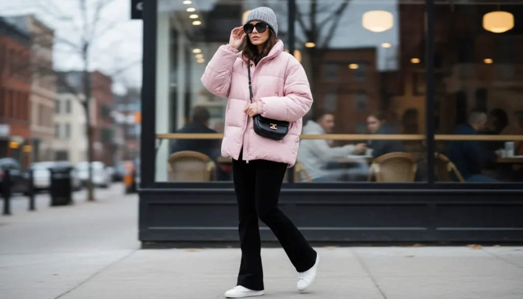 This one is for the days when you want color but you also want to look like you know what you’re doing. A pastel pink puffer jacket with black flared pants, white sneakers, a gray beanie, and sunglasses is that combination.