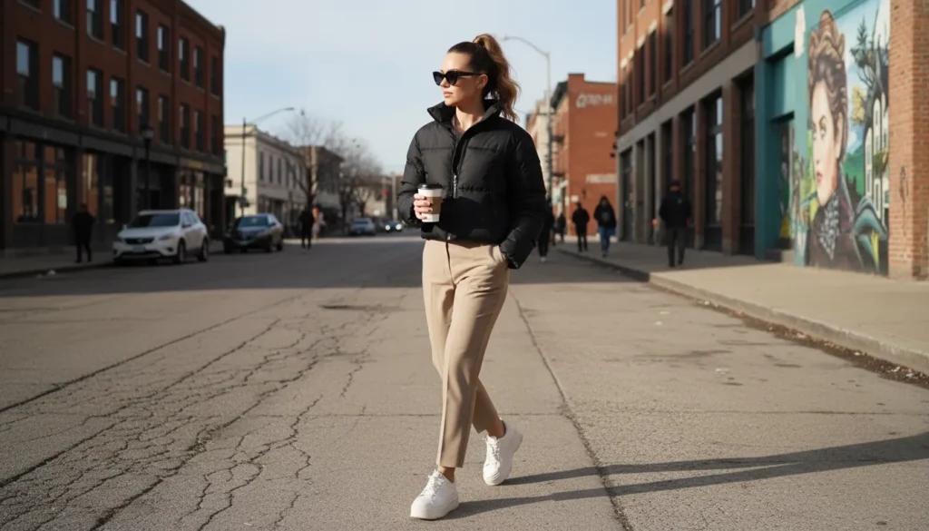 When in doubt, go black — but make it interesting. A cropped black puffer jacket with beige ankle pants and chunky white sneakers is that sweet spot between sporty and polished.