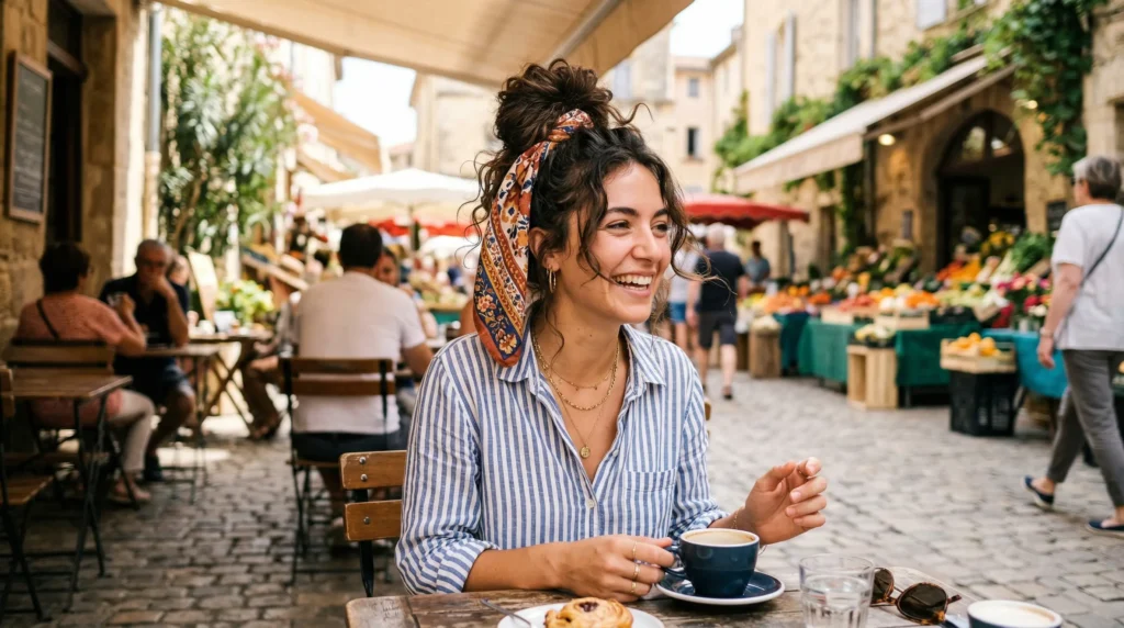 The scarf doesn’t need to match anything. Silk, cotton, vintage — whatever has texture and personality. That’s the vibe.